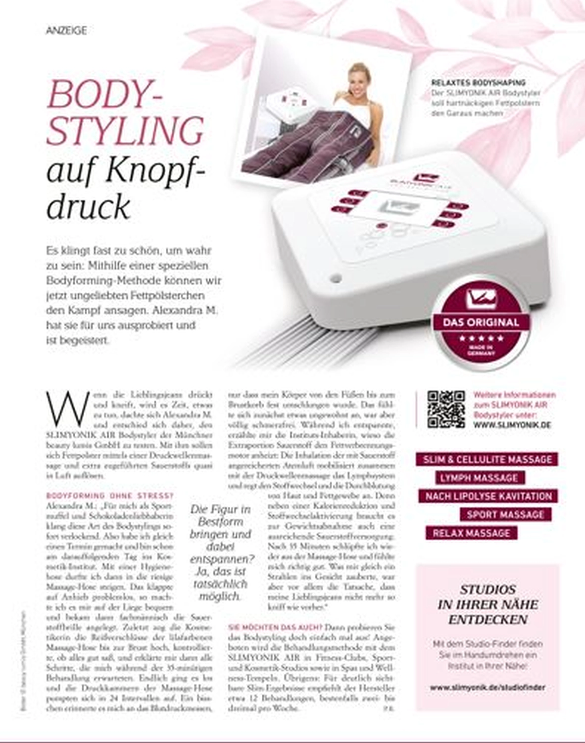 Wieso? Die Anzeigen erreichen, aufgrund der großen Auflage der GALA, viele Neukunden und machen unseren SLIMYONIK® bekannter. Wir überzeugen damit potenzielle Interessenten von den effektiven und sofort sichtbaren Wirkungen der SLIMYONIK®-Behandlung und verweisen über den Studiofinder auf Ihr Studio. Holen auch Sie mit dieser Unterstützung der vollen Marketing-Kraft das Beste für Ihr Studio heraus und freuen Sie sich auf viele neue Kunden.